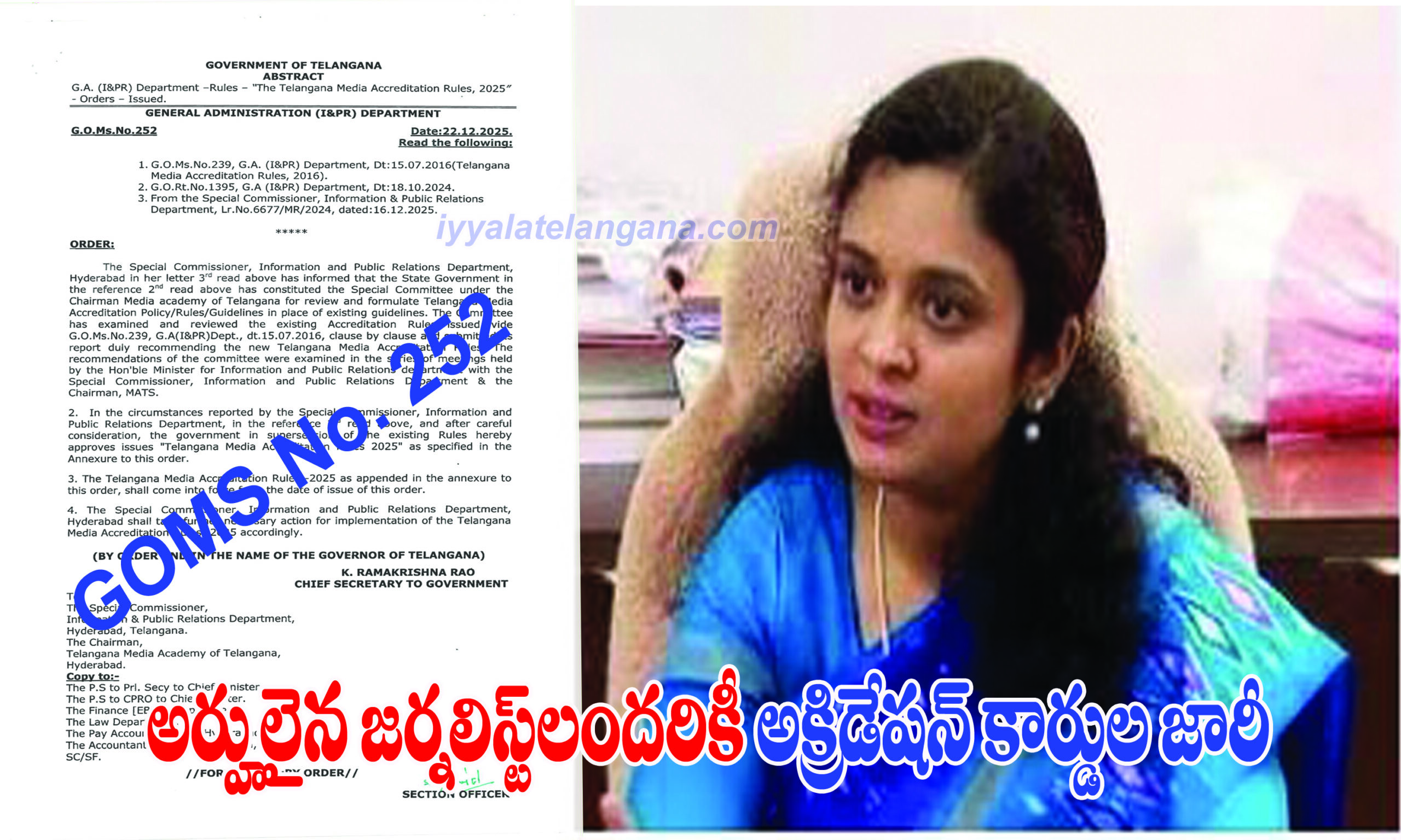 హైదరాబాద్, ఫిబ్రవరి 18 (ఇయ్యాల తెలంగాణ) : రాష్ట్రంలోని అర్హులైన జర్నలిస్టులందరికీ జి ఓ ఎం ఎస్ నెం. 252 ప్రకారం అక్రిడిటేషన్ కార్డులు జారీ చేయడం జరుగుతుందని సమాచార, పౌర సంబంధాల శాఖ స్పెషల్ కమిషనర్ సిహెచ్. ప్రియాంక ఒక ప్రకటనలో తెలిపారు. రాష్ట్రవ్యాప్తంగా ప్రింట్, ఎలక్ట్రానిక్, డిజిటల్, ఫ్రీ ల్యాన్సర్ మరియు వెటరన్ జర్నలిస్టులు అక్రిడిటేషన్ కోసం దరఖాస్తు చేసుకోవడానికి సమాచార శాఖ ప్రత్యేక వెబ్ సైట్ ను రూపొందించామన్నారు. https://ipr.telangana.gov.in/ వెబ్ సైట్ లో ఆన్ లైన్ ద్వారా దరఖాస్తు చేసుకోవాలన్నారు.ఈ నెల 9వ తేదీ నుండి దరఖాస్తు లను ఆన్లైన్ లో తీసుకోవడం జరుగుతుందన్నారు. అక్రిడిటేషన్ దరఖాస్తు మరియు జారీ ప్రక్రియ నిరంతరం కొనసాగుతుందని, దరఖాస్తు చేసుకునే సమయంలో ఏదైన టెక్నికల్ సమస్యలు ఉత్పన్నమైతే సమాచార శాఖ విÖడియా రిలేషన్ విభాగంలో ఈ నెంబర్ 9154170881 కు కార్యాలయం పని వేళలో ఉదయం 10.30 గంటల నుండి సాయంత్రం 5 గంటలలో సంప్రదించవచ్చునని ఆమె ఆ ప్రకటనలో తెలిపారు.